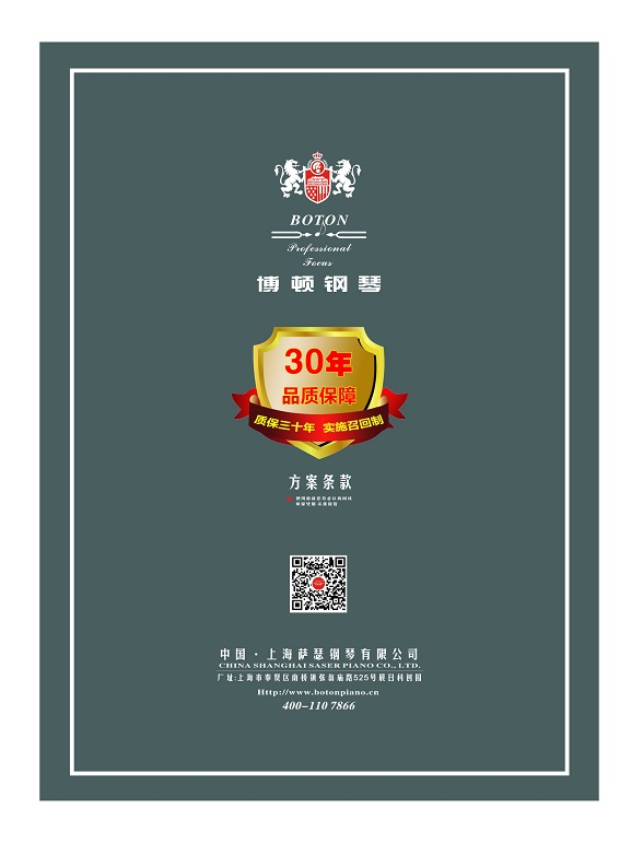 尊敬的用户,热烈欢迎您已成为BOTON(博顿)钢琴用户大家庭中的一员,祝贺您以睿智的目光选择了我们的产品,我们将为您提供卓越的品质和一流的服务。BOTON钢琴从在中国大陆注册成立生产十五年以来,在各项技术指标和制作工艺上都严格按照德国钢琴工艺标准生产制造,迄今为止已在生产和销售方面有了长足的发展,特别是在产品质量上多项指标已远远超过中国乐器行业国家标准和同行水平。现已被作为上海音乐学院国际钢琴大师班演奏用琴;西安音乐学院钢琴系,新疆师范大学音乐学院,上海交响乐团、合唱团演奏用琴;美国奥柏林国际钢琴大赛中国赛区指定用琴;上海国际书展专家指定演示用琴;上海浦东国际机场T2航站楼迎宾大厅形象展示指定用琴;厦门高崎国际机场迎宾大厅形象展示用情等。在销售商和消费者心目中已经建立起了良好的品质形象和信誉,品牌效应也日见彰显。为了酬谢广大BOTON用户的厚爱,确保BOTON钢琴的恒久卓越,我们特联合特约经销商向BOTON用户提供:1、电话定时回访;2、上门跟踪服务;3、特设咨询和监督投诉专线电话;4、对产品品质的保障管理切实实行“质保30年实施召回制”。