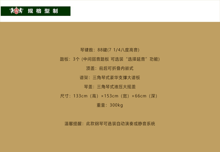 为了使您能够更加详尽全面了解钢琴的性能、特征和使用、保养等注意事项,也了解您和我们之间就有关产品责任和售后服务方面权利、义务产生和消除的约定,请您在使用前务必认真研读本产品使用维护说明书和质量担保承诺。任何不当的使用和操作都可能影响钢琴使用寿命、发音、音量、音色、和弹奏指触感觉;同时也将使你丧失提出索赔的权利。