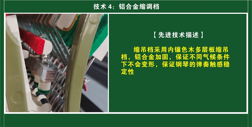 BOTON(博顿)钢琴为了防止因为温度、湿度、干寒、暖气辐射引发的中盘变形,特别使用了专业定制的"T型铝”、“加强型大槽钢”并采取中盘三段式锯断,取槽镶嵌“T型铝”,对敲大邦档槽钢,以对敲螺丝锁死的固定办法,确保了极端环境下钢琴的正常使用。