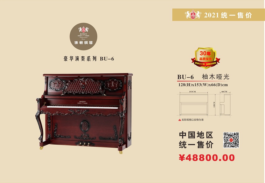 尊敬的用户,热烈欢迎您已成为BOTON(博顿)钢琴用户大家庭中的一员,祝贺您以睿智的目光选择了我们的产品,我们将为您提供卓越的品质和一流的服务。BOTON钢琴从在中国大陆注册成立生产十五年以来,在各项技术指标和制作工艺上都严格按照德国钢琴工艺标准生产制造,迄今为止已在生产和销售方面有了长足的发展,特别是在产品质量上多项指标已远远超过中国乐器行业国家标准和同行水平。现已被作为上海音乐学院国际钢琴大师班演奏用琴;西安音乐学院钢琴系,新疆师范大学音乐学院,上海交响乐团、合唱团演奏用琴;美国奥柏林国际钢琴大赛中国赛区指定用琴;上海国际书展专家指定演示用琴;上海浦东国际机场T2航站楼迎宾大厅形象展示指定用琴;厦门高崎国际机场迎宾大厅形象展示用情等。在销售商和消费者心目中已经建立起了良好的品质形象和信誉,品牌效应也日见彰显。为了酬谢广大BOTON用户的厚爱,确保BOTON钢琴的恒久卓越,我们特联合特约经销商向BOTON用户提供:1、电话定时回访;2、上门跟踪服务;3、特设咨询和监督投诉专线电话;4、对产品品质的保障管理切实实行“质保30年实施召回制”。
