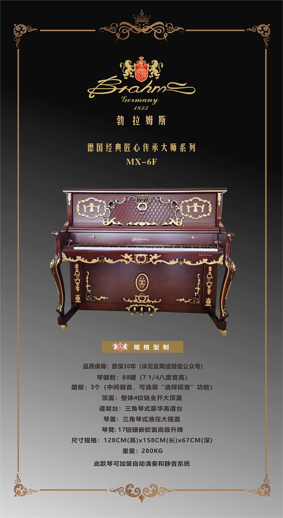 尊敬的用户,热烈欢迎您已成为勃拉姆斯 Brahms 钢琴用户大家庭中的一员,祝贺您以睿智的目光选择了我们的产品,我们将为您提供卓越的品质和一流的服务。Brahms 钢琴从进入中国大陆20年以来,在各项技术指标和制作工艺上都严格按照德国钢琴工艺标准生产制造,迄今为止已在生产和销售方面有了长足的发展,特别是在产品质量上多项指标已远远超过中国乐器行业国家标准和同行水平。现已被作为上海音乐学院国际钢琴大师班演奏用琴;美国奥柏林国际钢琴大赛中国赛区指定用琴;上海国际书展专家指定演示用琴;上海浦东国际机场T2航站楼迎宾大厅形象展示指定用琴;厦门高崎国际机场迎宾大厅形象展示用情等。在销售商和消费者心目中已经建立起了良好的品质形象和信誉,品牌效应也日见彰显。为了酬谢广大Brahms 用户的厚爱,确保Brahms 钢琴的恒久卓越,我们特联合特约经销商向 Brahms 用户提供:1、电话定时回访;2、上门跟踪服务;3、特设咨询和监督投诉专线电话;4、对产品品质的保障管理切实实行 “质保30年,实施召回制”。
