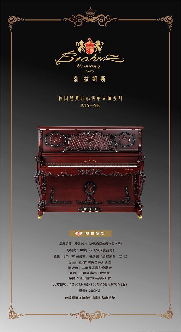 勃拉姆斯Brahms 钢琴采用不等厚非对称曲面分布,加强低音的共鸣,各音区音色连贯、统一和饱满。