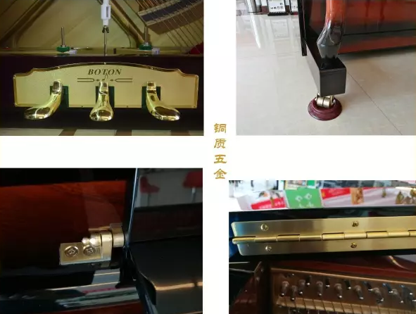 钢琴是贵重耐用的大型乐器,BOTON(博顿)钢琴均采用铜质五金电镀,包括脚轮、铰链、支撑杆、踏板、脚档护板,液压等,精密铸造,恒久可靠。  为了防止在不经意间键盘盖突然倒下造成手部受伤或漆面碰撞,.BOTON(博顿)钢琴精选通过10万次疲劳测试的专业液压缓降装置。确保您在任何时候都可以安心、安全演奏不出意外。