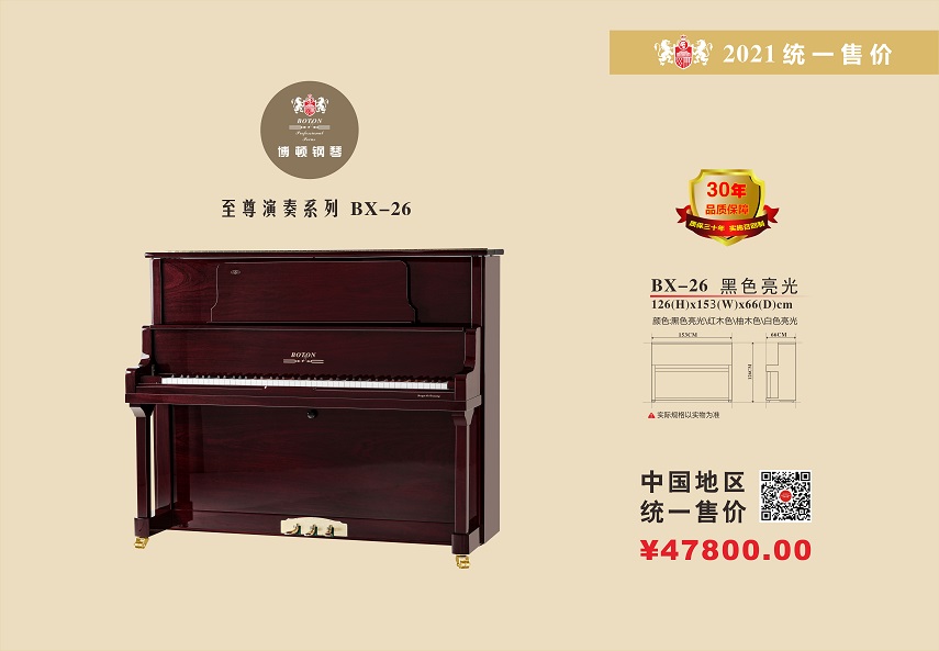 BOTON(博顿)钢琴采用不等厚非对称曲面分布,加强低音的共鸣,各音区音色连贯、统一和饱满。