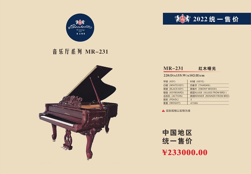 尊敬的用户,热烈欢迎您已成为勃拉姆斯 Brahms 钢琴用户大家庭中的一员,祝贺您以睿智的目光选择了我们的产品,我们将为您提供卓越的品质和一流的服务。Brahms 钢琴从进入中国大陆20年以来,在各项技术指标和制作工艺上都严格按照德国钢琴工艺标准生产制造,迄今为止已在生产和销售方面有了长足的发展,特别是在产品质量上多项指标已远远超过中国乐器行业国家标准和同行水平。现已被作为上海音乐学院国际钢琴大师班演奏用琴;美国奥柏林国际钢琴大赛中国赛区指定用琴;上海国际书展专家指定演示用琴;上海浦东国际机场T2航站楼迎宾大厅形象展示指定用琴;厦门高崎国际机场迎宾大厅形象展示用情等。在销售商和消费者心目中已经建立起了良好的品质形象和信誉,品牌效应也日见彰显。为了酬谢广大Brahms 用户的厚爱,确保Brahms 钢琴的恒久卓越,我们特联合特约经销商向 Brahms 用户提供:1、电话定时回访;2、上门跟踪服务;3、特设咨询和监督投诉专线电话;4、对产品品质的保障管理切实实行 “质保30年,实施召回制”。